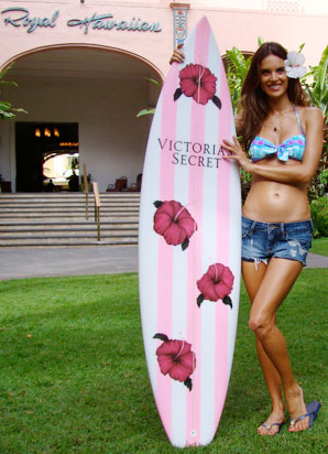 This board is an example of what we can do. It was made for VS, to give to their surf angel, Alessandra Ambrosio. Hand shaped by Kevin Seid, 6'1" x 18 1/4" x 2 1/8" double concave thruster for fast Brazilian beach breaks. Prices are worth it. Please call. Visit the VS store in Waikiki to see another version of the board and see if they have any pink board shorts available.